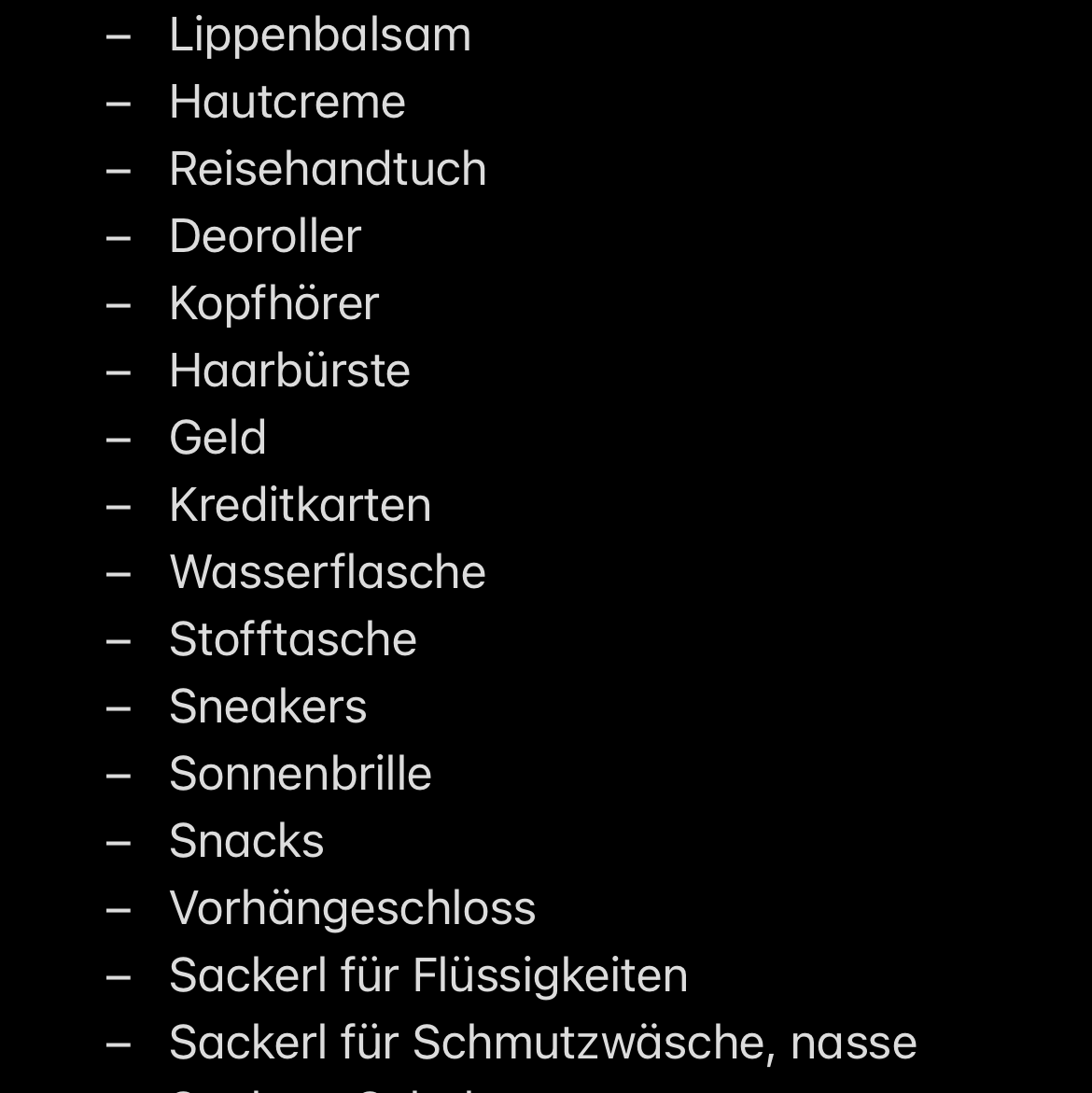 - Bauchtasche – Um Wertgegenstände am Körper tragen zu können. Auch toll für Busfahrten.