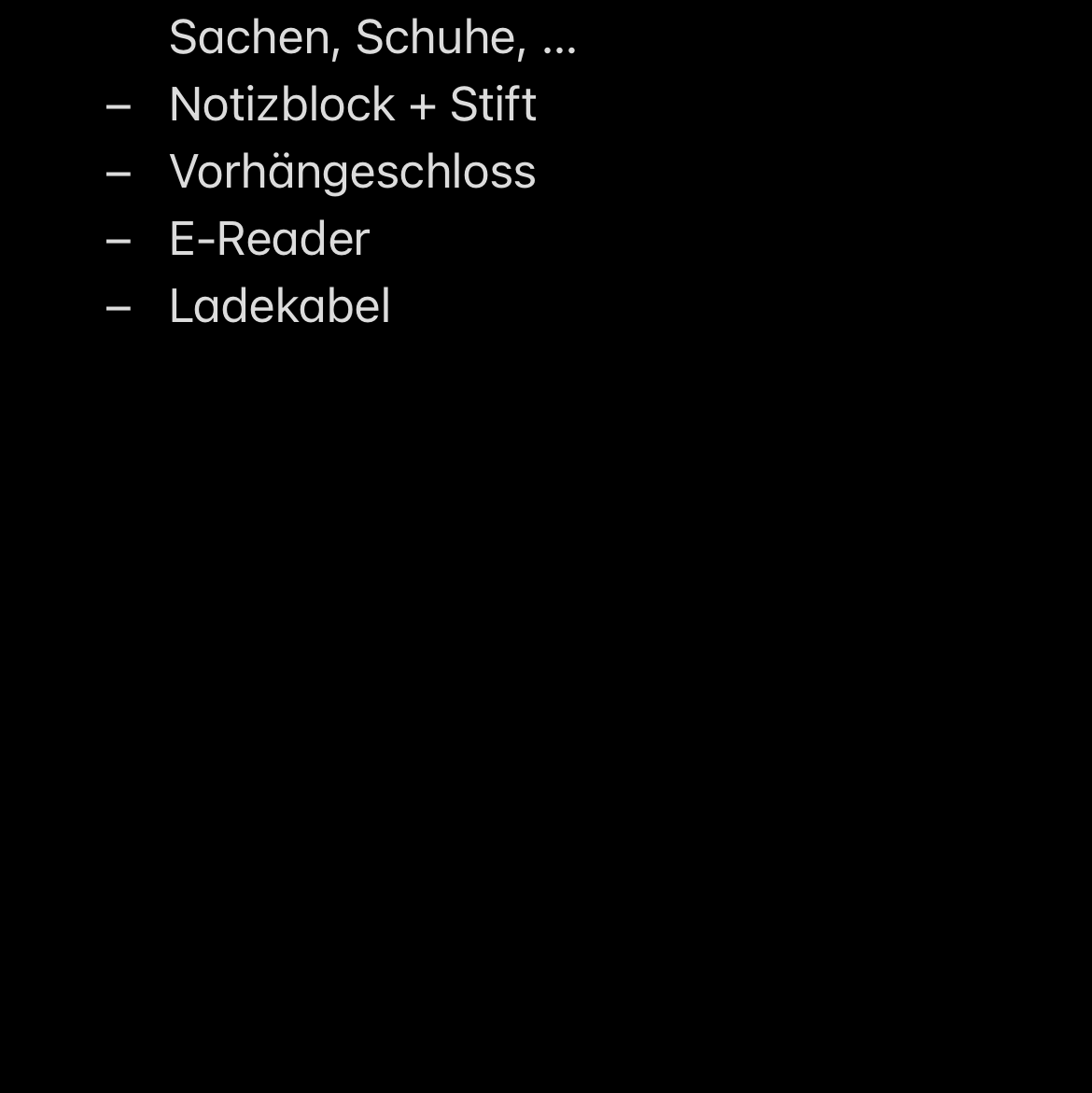 Meine ungefähre Packliste für 2 Monate Südamerika (das Vorhängeschloss ist sehr wichtig, weshalb ich es gleich zwei Mal erwähnt habe):