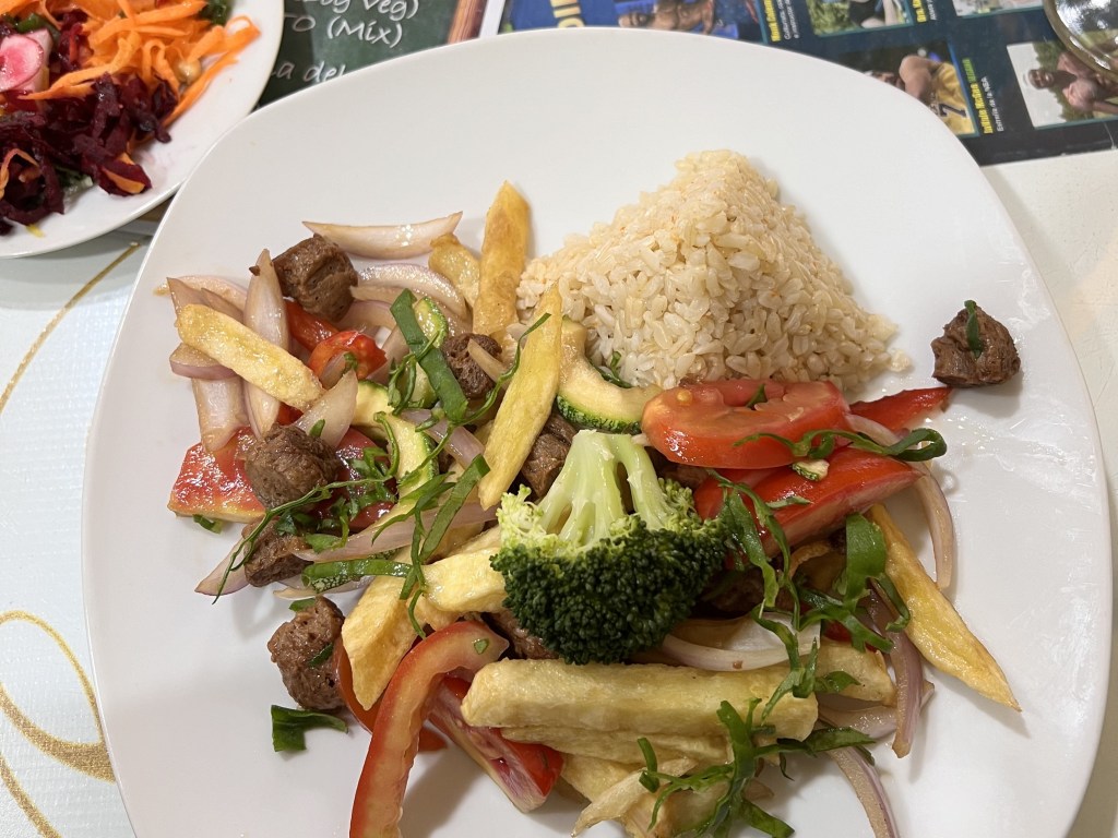 Nach meinem doch etwas anstrengenden Stadtrundgang gab es dann endlich Mittagessen im Loving Hut Vegan. Wie der Name schon verratet werden hier vegane Speisen angeboten. Von solchen Lokalen gibt es in Südamerika nicht viele, aber es gibt sie eben doch. Im Loving Hut Vegan ist die Speisekarte nicht nur ausschließlich vegan, sondern es werden vor allem auch traditionelle Peruanische Gerichte zubereitet, nur ohne Fleisch halt. Für wenig Geld bekommt ihr ein Mittagsmenü mit Suppe, Salat vom Buffet, Hauptspeise und ein kleines Dessert, sowie einem Getränk. Zum Hauptgang gab es für mich Lomo Saltado, ein typisches Gericht, das normalerweise mit Rindfleisch, hier mit Sojafleisch, zubereitet wird. Ist natürlich nicht ganz das selbe, für experimentierfreudige Veganer jedoch eine gute Option.