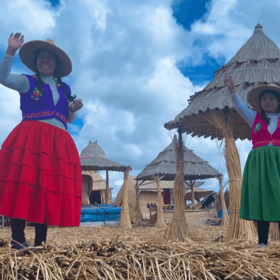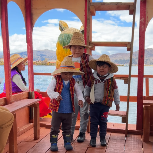 Ursprünglich lebten die Aymara vor allem vom Fischfang. Am Land wurde die Ausbeute schließlich gegen andere Lebensmittel und Produkte getauscht. Heute profitiert die Gesellschaft aber sehr stark vom Tourismus. Und das merkt man. Schon als wir auf der ersten Insel ankamen, wurden wir von drei Frauen begrüßt, die für uns sangen. Auf den Inseln bekamen wir dann eine kurze Einführung in das Leben auf den Inseln und anschließend wurden wir in die Häuser der Bewohner eingeladen. Kleine Hütten aus Stroh, in die nicht mehr als ein kleines Bett passte. Sogar deren Kleider durften wir anprobieren um Fotos damit zu machen. Zudem waren einige Souvenir-Stände aufgebaut und uns wurde erzählt, dass sie vor kurzem erst mit den ersten Schwarz-Weiß-Fernsehern ausgestattet wurden. Später sangen auch noch drei kleine Jungen für uns ein Lied. Das kam mir schon alles etwas suspekt vor.